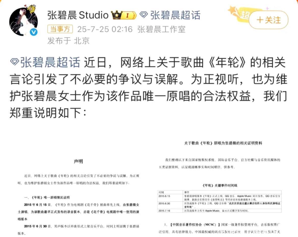 2个多小时之后,张碧晨责任室发布声明,力求我方是独一原唱。